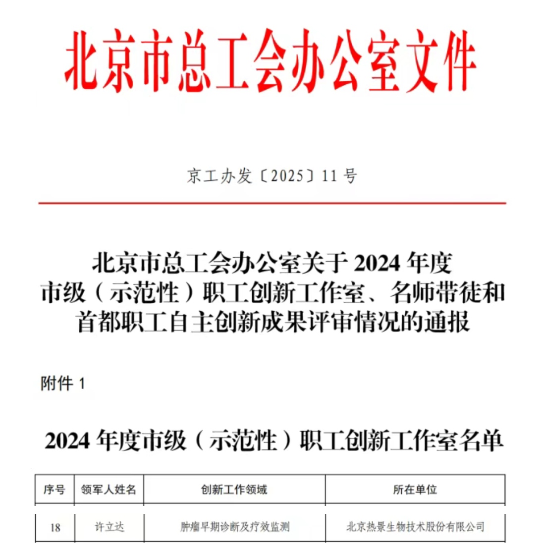熱景生物「腫瘤早期診斷及療效監(jiān)測(cè)」工作室榮獲“北京市級(jí)職工創(chuàng)新工作室”稱號(hào)
