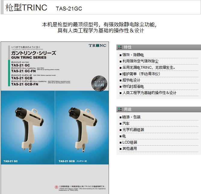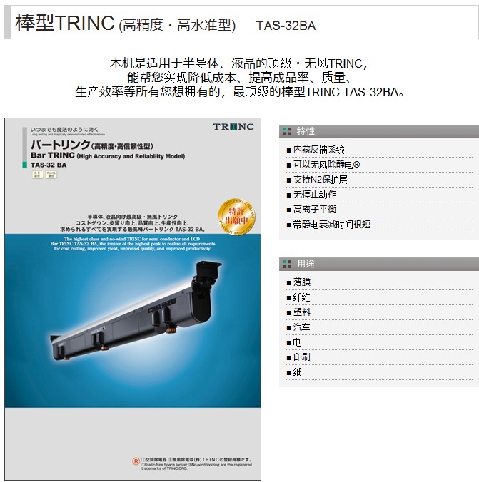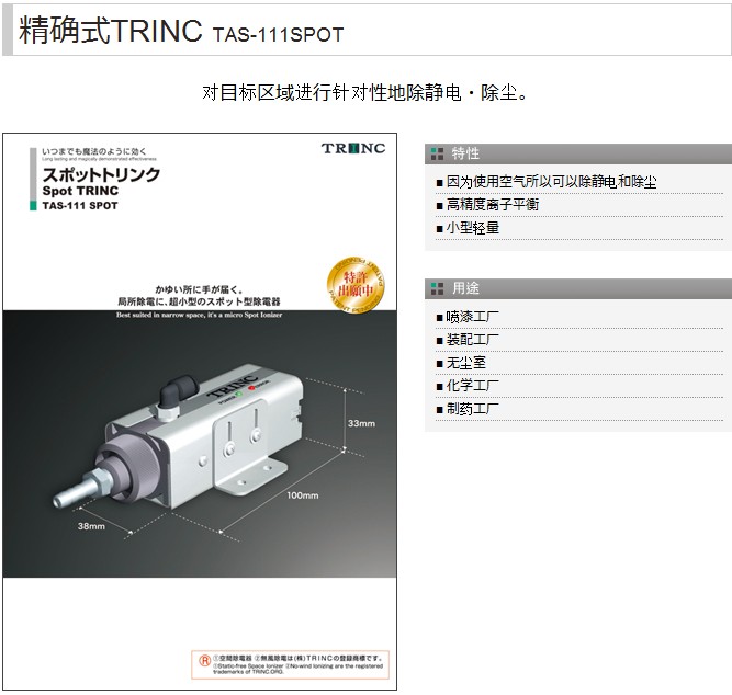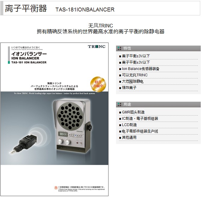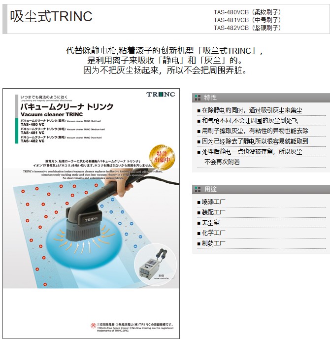 為了防止因?yàn)轱L(fēng)而引起的微粒的四處飛散,讓無塵室、無塵工作臺的能力得到100%的發(fā)揮,無風(fēng)除靜電是必不可少的。日本TRINC除靜電裝置,世界上首次使用*的技術(shù),在廣大空間里釋放離子,讓工廠里的靜電全部消失,實(shí)現(xiàn)灰塵完全不附著的無塵環(huán)境。TRINC, 又名"無墻防塵" 在汽車、電子、化工、食品、藥品等各個領(lǐng)域里,大量減少了由異物不良品。